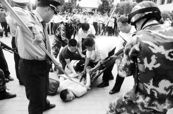 5月19日,为增强校园防恐怖袭击应急处突能力,德州市实验小学和武警德州支队在校园内举行处置劫持人质演练,针对劫持学生的袭击行为进行紧急处置。 本报记者 马志勇 通讯员 曹荣辉 摄影报道