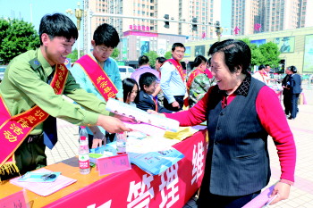 5月12日,庆云县开展应急知识宣传活动,普及应急知识,提高公众应急避险和自救互救能力。图为工作人员向群众发放宣传单。 薛密质 摄