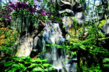 | 植物馆里瀑布和假山旁搭配种植了各种植物。本报记者 杨广帅 摄 |