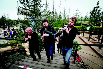 19日,法国布列尼塔风笛乐队演奏会在世园会国际园舞台上演。5位优秀的艺术家用风笛、单簧管等乐器,为游客们带来一场欢快的听觉盛宴。