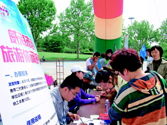| ▲19日上午,威海旅游局及十余家涉旅企业在人民广场开展公益宣传,现场办理照的市民络绎不绝。 记者 冯琳 摄 |