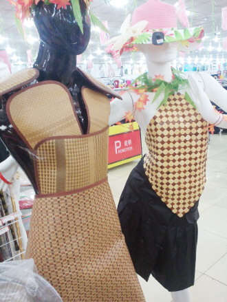 时间:2014年5月10日 自述:超市里凉席和坐垫在模特身上展示。 点评:超市大妈又发挥想象力了。