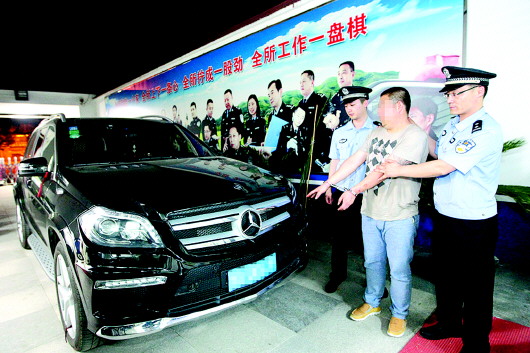 抢车男子在指认抢劫的“奔驰”GL500汽车。 (警方供图)