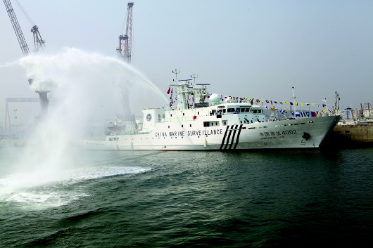| 21日,“中国海监4002”在进行水炮射击表演,射程可达百米。 本报见习记者 徐翰云 摄 |