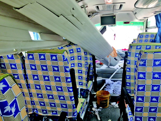 | ◥爆炸发生后,车内一片狼藉。 |  | 中巴车窗玻璃被炸碎。 |