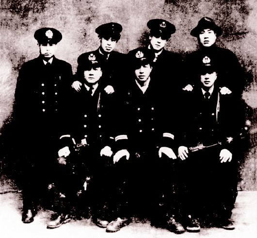 ◥“黄安”舰抵达连云港后,全舰官兵与插满伪装松枝的舰艇合影。 |  | “黄安”舰起义骨干合影。 |