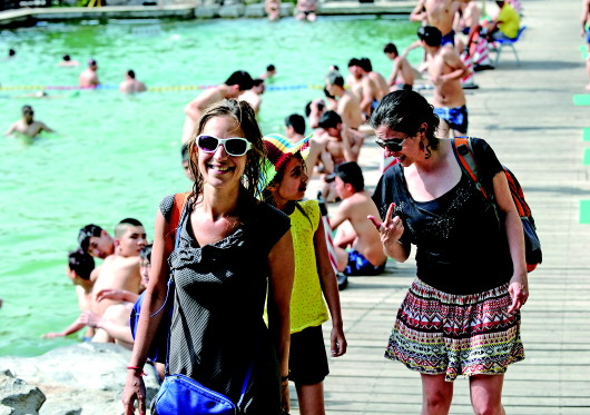 21日,省城最高温达到35.2℃,成为今年首个高温日。在泉水浴场,众多市民赶来游泳降温。这不,连外国友人都来凑热闹避暑了。 本报记者 周青先 摄