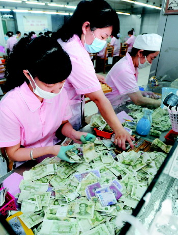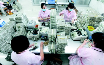 | 点钞员每天要处理数以万计的硬币、纸币。 |  | 经过多道工序后,零散的钞票被打包。 |