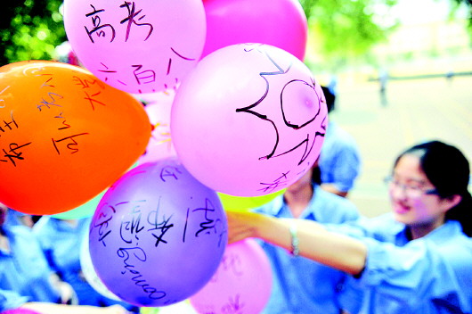 “高考、六百八!”“高考我不怕!”“同学们,加油!”20日,在山东省实验中学操场上,高三的学生们将自己想说的话写在五颜六色的气球上,并一起放飞了写满心愿、鼓舞和期盼的气球。随着高考的临近,为了让高三学生从容应对高考,学校开展了各种减压活动。 本报记者 王媛 摄