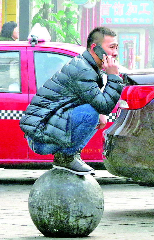 自述:小伙子蹲在大石球上打手机。