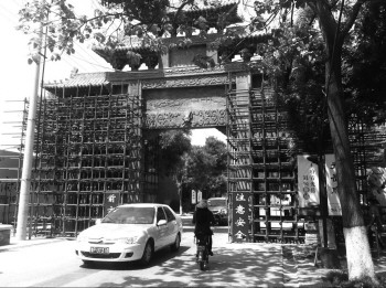 | 西关街上被钢筋架包围的牌坊。本报记者 王瑞超 摄 |