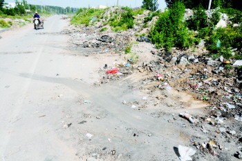 | 医疗垃圾已被清运,但堆放在桥上的大量土石方和生活垃圾仍占据大半条道路。 本报记者 马志勇 摄 |
