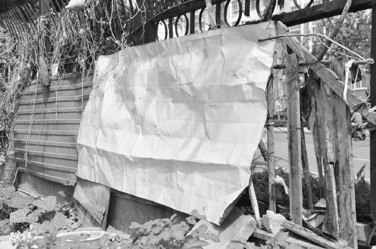 | 华滨嘉园小区北边坏掉的栅栏被物业公司工作人员用铁板补上。 |
