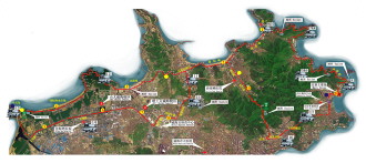 2014年威海长距离铁人三项世界锦标赛比赛路线(红线)正式敲定。据比赛路线设置,有10个集中观赛(展示)区可供市民近距离观看赛事,分别为:1.靖子龙王庙、2.葡萄滩海水浴场、3.金海滩海水浴场、4.国际海水浴场大帆处、5.火炬大厦广场、6.山东大学(威海)南大门、7.哈工大(威海)南大门、8.威海体育场北门、9.北山路坡顶(森林防火指挥部)、10.主赛场终点门。