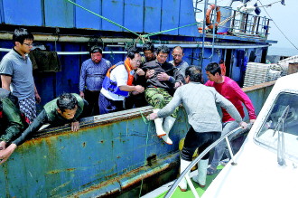 | 海事局工作人员前往事发海域,救助两名受伤的渔民。 通讯员 张志利 摄 |