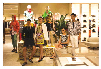 17日下午,贵和购物中心的Rainbow品牌综合店内,举办了一场耳目一新的时尚派对,甜甜的爆米花和身穿粉、黑蕾丝裙装的可爱“女佣”们让来宾们宛若置身于浪漫醉人的异国花都。中国新晋超模吴文祥引领十几位名模亮丽登场,展示了店内Dsquared2,Maison Martin Margiela,Roberto Cavalli,Valentino,Versace Collection及Viktor&Rolf等国际时尚品牌的2014春夏最新潮流,带来了一场崭新的视觉盛宴。