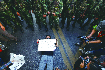 | 23日,曼谷一名男子躺在街头抗议军方政变。当天,一些民众集会抗议军方政变。新华/路透