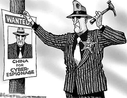 “美国”黑客正在把通缉令钉在柱子上。通缉令上写着:“因网络间谍活动通缉中国。”