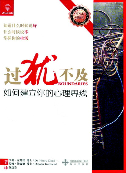 本期登场:李秀珍 《过犹不及》 亨利·克劳德 约翰·汤森德 著 海天出版社 有一段时间,心里总有很多纠结,为姐姐遭遇的婆媳不和,为好友婚姻中的背叛欺骗,为堂哥突染重病的沉重债务,等等等等不一而足,总想帮一把又力不从心,心中感到有些不堪承受之重。 一个偶然的机会,搞心理咨询的朋友推荐给我一本《过犹不及》。看过后几乎所有心中块垒都瞬间释然。作者在书中明确告诉你:想要有一个平衡健全的生活,必须给自己设立一个明确的界线,知道自己应该为哪些东西负责、不该为哪些东西负责。这些界线包括身体上的、心理上的、情绪上的和属灵上的。即使是自己最亲近的母亲、最挚爱的丈夫、最心疼的孩子,对他们的要求,你也完全有拒绝的权利。或者有很多时候,他们只是向你倾诉一下而已,你根本无需过多牵挂和奔忙。有很多事情你去帮了,反倒适得其反,这就叫“过犹不及”,或者叫“越界”。这是一本对你的生活很有帮助的书。