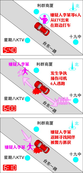 本报记者 刘腾腾 曹思扬 本报通讯员 李旭东 六名乘客想上同一辆出租车,被司机拒绝,双方争执中,其中一人持弹簧刀将出租车司机连捅三刀,造成的哥腹部、腿部和后背受伤,伤人者逃跑10分钟后折返现场想救同伴,被赶到现场的民警抓了个正着。经过救治,出租车司机已无生命危险。 六人欲同上一辆车,的哥拒绝被捅伤 25日早上6点钟,市北公安分局台东派出所民警接到报警,在台东一路星期八KTV对面的马路上,一名的哥被人捅伤。接到报警后,民警很快赶到现场。 “当时在马路中间停了一辆出租车,出租车驾驶室的门开着,司机躺在驾驶室里浑身是血,腹部、腿部都是伤口。”赶到现场的民警介绍。在离出租车不远处,一名市民拦住一个男青年,经审问,这名男青年正是伤人者。民警随即将嫌疑人李某控制,并将受伤的司机送往医院救治。 据现场目击者介绍,早上5点40分左右,李某和五名同伴从星期八KTV里走出,在KTV对面的马路上拦住了一辆出租车,“当时6个人想上同一辆车,被司机拒绝,其中一名穿黑衣服的男子走上前踹了车头两脚,司机下车理论,双方就产生了争执。” 民警告诉记者,争执中,李某手持弹簧刀捅向司机的腹部、大腿和后背。见司机受伤倒地,6人迅速逃跑。“当时李某和女友往利群商厦的方向逃跑,其他4人往19中的方向逃跑。”几分钟后,李某再次返回现场,被一名市民拦下交给警察。 的哥身现三处刀伤,经救治已脱险 民警将李某控制后,拨打120,将受伤的的司机送到了海慈医院。 下午1点多,在海慈医院急诊室,受伤的的哥王师傅躺在病床上正在输液,他的家人还没赶到医院,只有一个朋友在陪着他。王师傅的脖子上有两道血痕,左下腹部位有一处明显的刀口,尽管贴着厚厚的纱布,还是有不少血迹渗出,大腿上也有伤口。 “疼、好疼啊,那帮人连着捅了我三刀,捅完后我就什么都不知道了,现在感觉两眼发黑。”王师傅说,他的意识还算清楚,只是伤口依然很疼。 据急救医生介绍,王师傅身上共三处伤口,分别在腹部、大腿和后背,没有伤到重要脏器,所以没有生命危险,接下来需要做手术缝合伤口。 打工者酒后伤人,10分钟后自投罗网 下午1点半,记者在台东派出所见到了嫌疑人李某,说起上午发生的一幕,李某直呼后悔。 李某是临沂人,不久前来青岛打工,在附近一家洗浴中心做修脚工。25日凌晨1点多,他下班后约了几个干弟弟和干妹妹到KTV唱歌,期间喝了不少啤酒。早上5点40分左右,一行人玩够了准备打车回家,“当时我们要上车,那个司机不让,我干弟弟就和他发生了冲突,两人都动了手,我本来是上前拉架的,但回头一看,那个司机打了我干弟弟一拳,打完后还冲着我来了,嘴里还不干不净的。”说起争执的过程,李某依然气愤不已。 想起自己衣服口袋里有一把弹簧刀,李某翻出刀子就捅向了司机,连捅三刀后他清醒过来,意识到事情的严重性后,便和同伴分头逃跑了。跑了10分钟后,他以为同伴还在现场,就折返回来相救,被一名目击的市民拦下,交给了警察。 目前,李某因涉嫌故意伤害已被警方刑事拘留。民警提醒,李某的几名同伴看到报道后请迅速到台东派出所说明情况。