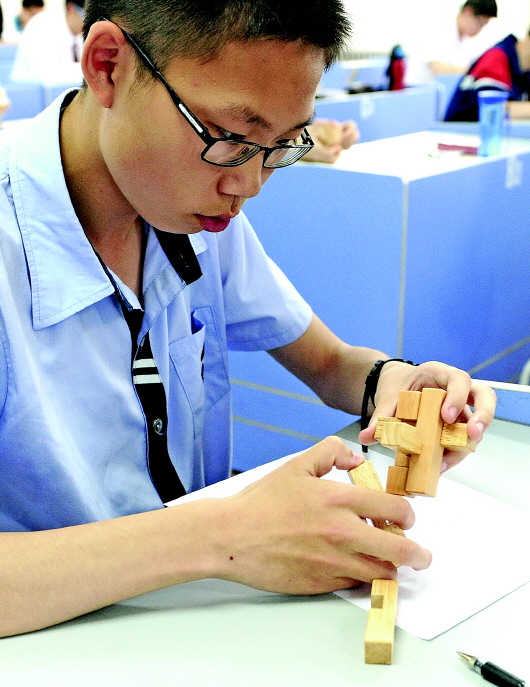 | 26日,山师附中招收推荐生的测试中,考生在拆解拼装鲁班锁。 本报记者 周青先 摄 |