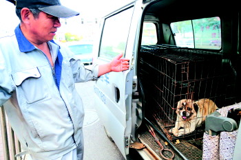 26日,芝罘区流浪动物收容站的工作人员在胜利路附近收容市民发现的大型流浪犬。工作人员提醒市民,如果发现具有攻击性的大狗或者可怜的流浪狗,请联系专业人员进行收容,有爱心的市民也可以到公安部门和居委会开具证明后到收容站领养小狗。