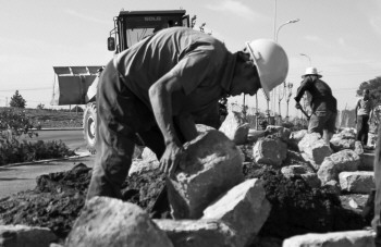 26日,德州城区的最高温已到达33℃,在新修的滨河大道新河路北侧,几位建筑工人在修建防土墙,他们的平均年龄为70岁,最年长的已有77岁。近60岁的退伍老兵是队伍里最年轻的,搬石的力气活主要靠他。 本报记者 王小会 摄