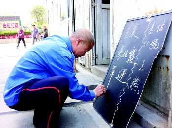 本报济宁5月27日讯(记者 孔令茹) 小区业主的网购包裹越来越多,好多业主常因取件不及时导致包裹积压。为解决这个问题,御水豪庭的保安韩继琛秀出一手好字,用粉笔在黑板上写出包裹收件人姓名,每日更新,得到业主的一致好评。 25日,记者来到城区御水豪庭小区,在传达室门口看到一块小黑板,粉笔书写着几行潇洒苍劲的行楷字体。写字的叫韩继琛,是这个小区的保安,他每天都会都小黑板上实时更新内容,包括包裹和信件收件人部分。 “我从小就喜欢写字,毛笔字、钢笔字我都练过,一个汉字我要练习十几种字体,从中找到最喜欢的写法,到现在最喜欢的字体就是行楷。”60岁的韩继琛说,直到现在,他还保持着摘抄诗句、新闻的习惯,随时随地把感兴趣的文字记下来,因为他相信“好记性不如烂笔头”。 从两三年前开始,韩继琛发现小区里包裹越来越多,问了小区里的年轻人,才知道这是从网上购买的物品。网购的人越来越多,韩继琛的工作也遇到了问题。“快递公司将快件送到小区传达室,但业主一般都在单位上班,下班回家路过传达室就忘了取。”韩继琛说,这个小细节不仅影响了业主收快件的时间,由于传达室快件积压过多,找快件也非常麻烦。 韩继琛说,后来他就想到每日在黑板上更新包裹收件人的名字,业主下班路过传达室就会多看一眼。如业主已取件,他会立即擦去名字,收到快件后,也会第一时间公布。 业主杜先生说,下班回家看黑板已成为一种习惯,老韩的粉笔字更是让人赏心悦目。“两三年间,收发件没出现过一次差错,业主们满意,我工作也开心。”韩继琛说,在小区做保安已6年,如今这300多户业主就像他的朋友一样。