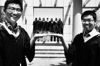 四年大学生涯即将结束。27日,在山大(威海)校门前,测控专业的大四学生穿上学士服,聚在一起拍照留念。据学生刘朝晨介绍,他们班级男生多,女生少,所以班上的女生格外受关照。图中,两位男生将几位女同学捧在手心。