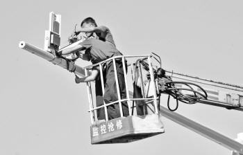 26日,工作人员在城区向阳路与振兴路路口安装电子眼。据了解,多个路口电子眼被维修或重装。