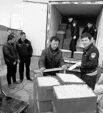 去年以来,烟台莱山区公安分局在相关部门的配合下,破获了多起涉及食品安全的案件。其中包括夫妻俩加工病死鸡、无根素造毒豆芽、工业盐加工猪皮冻等案件,查获的有毒食品有的使用了国家禁止的添加剂,有的使用了强致癌物,查获的病死鸡携带大量病菌,人食用后严重威胁健康。 夫妻俩加工十余吨病死鸡 警方斩断供销链,抓获12人 从多家养鸡场收购病死鸡,再把加工好的白条鸡销售给食堂、餐馆和普通市民。2010年以来,莱山区一对夫妇先后制售病死鸡十余吨,去年9月,莱山警方一举斩断了这个产供销利益链条,抓获12名嫌疑人。 掌握了病死鸡来源和销售渠道后,莱山公安分局食药环侦大队于去年9月份将张某、孙某夫妇抓获,一举捣毁病死鸡加工窝点,现场查扣病死鸡1000多斤。经审讯,犯罪嫌疑人张某夫妇自2010年以来,以早市批发、送货至餐厅、小吃部等为销售渠道,先后制售病死鸡十余吨,获利十余万元。 莱山公安分局食药环侦大队民警介绍,病死鸡经过加工后,外表与正常鸡区别不大,但市民可以从鸡的个头上初步识别。“正常鸡长到35天至45天出笼,重达三四斤,病死鸡往往生长天数不足,重2斤左右。”民警说,病死鸡除体内携带大量病菌,往往还含有未消化的药物成分,人们食用后危害极大。