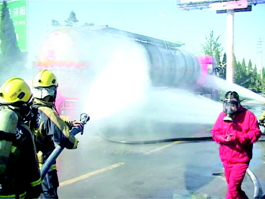 | 消防队员在向泄漏的罐车喷洒清水和泡沫。 消防供图 |