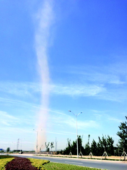 本报5月28日讯(记者 孟燕 戚云雷) 省城西部出现了龙卷风?28日,市民李先生向本报反映,他从长清返回市区的过程中看到了“龙卷风”。记者向气象专家求证,其实是尘卷风。 “黄白色的柱状云,很高很大。”28日上午10点40分左右,李先生和4位朋友驾车从长清返回济南市区,走到快接近京福高速1000米左右等信号灯时,5个人同时看到了“龙卷风”。李先生表示,当时他们在道路东侧,“龙卷风”在西侧,距离他们100米左右,黄白色的柱状云有四五层楼高。“当时天空晴朗,和周围的景色对比,龙卷风很明显,不过没看到周围树木晃动,也没听到声音。” 他和朋友们被眼前一幕“震撼”了,都拿出了手机拍下照片。记者从照片中看到,柱状云确实和有些类型的龙卷风有些相似。 “肯定不是龙卷风,应该是尘卷风。”济南市气象台预报员尹承美解释,龙卷风是一种强烈的、小范围的空气涡旋,是在极不稳定天气下由空气强烈对流运动而产生的、由雷暴云底伸展至地面的漏斗状云产生的强烈的旋风。 根据记录,济南出现龙卷风的情况非常少,局地强对流天气的表现形式主要是短时强降雨、雷暴、大风,有时还会出现冰雹。1987年8月26日平阴、长清境内以及2006年7月31日十六里河镇出现过龙卷风,受灾情况较为严重。“龙卷风破坏力强大,要是没有听到什么动静,肯定不是龙卷风。” 尹承美解释,市民拍到的是尘卷风,由于地面局部增热不均匀而形成的一种特殊的旋转对流运动。“尘卷风是一种正常的天气现象,在近地面气层中产生的一种尺度很小的旋风,它可以把尘土和一些细小的物体卷扬到空中,形成一个尘柱。”