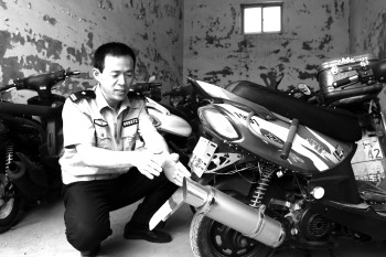 | 办案民警介绍,这类摩托车大都改装了排气管。 |  | 嘉祥县拘留所内,民警正在向小李了解情况。 本报记者 岳茵茵 摄 |