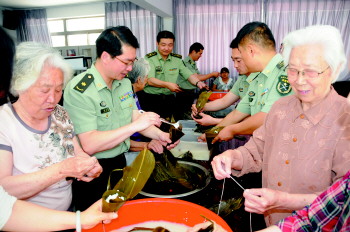 27日,在潍坊市民生街社区,社区居民跟辖区内的部队官兵一起包粽子。临近端午节,民生街社区组织居民到辖区内的部队驻地,与部队官兵一起包粽子过端午。