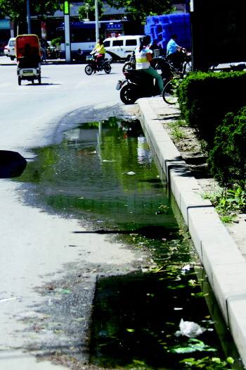 28日,在东风西路与迎宾大街西北角,一处堵塞的下水道不断往外冒臭水,不少在此经过的市民都掩面而行。