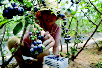 | 工人正在大棚内采摘成熟的蓝莓。 殷萍 摄 |