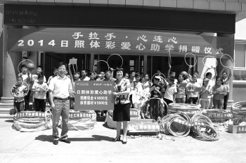 5月28日,日照体彩员工和东港文体局分别向日照街道第四小学捐助了4000元现金和价值5000元的体育器材。体育器材捐给学校,让学生们在体育课等锻炼时间使用;4000元现金分别捐助给8名贫困学生。