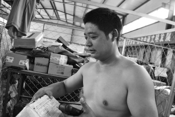| 29日,在泰安中通速递公司,林建伟正忙着分拣快件,虽然他脱下了上衣,但仍然热得满头大汗。 本报记者 侯峰 摄 |