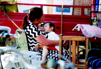 |  | 中午时分,在路上奔波的快递员。 |  | 抱着入睡孩子的卖水人。 |  | 站牌下工人席地而睡。