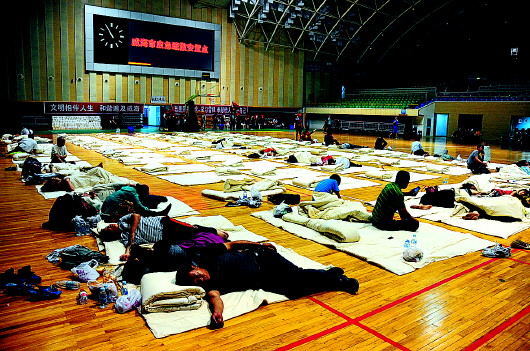 | ▲威海多处应急避难场所开放,图为疏散人员在体育馆临时安置点休息。