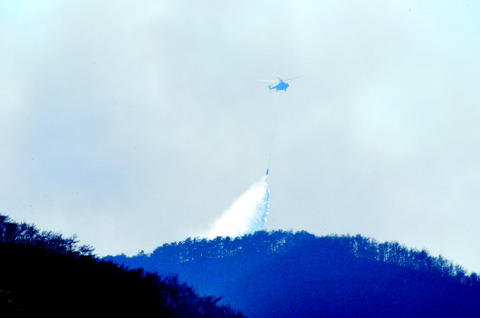 |  | ◥30日15时许,山火仍在不断蔓延,图为军用直升机在扑救山火。
