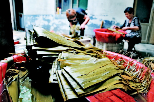 ◤位于运河畔的济宁市任城区长沟镇后薛村,包粽子已有600年的历史。到了每年的端午节,村民朱秀芝一天能卖上千个粽子。图为朱秀芝家人分工明确,制粽叶、淘糯米,大家有条不紊地忙碌着。 本报记者 张晓科 摄
