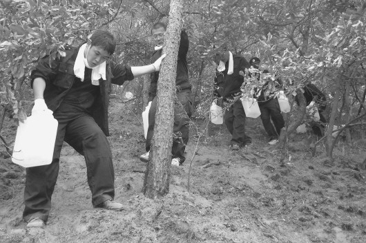 | 灭火人员用水桶提水,翻山越岭,查死角灭余火。 本报记者 陶相银 摄