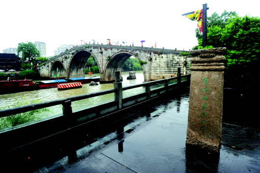 | 1日,考察队一行来到杭州京杭大运河南端标志性建筑拱宸桥。拱宸桥下货船、游船川流不息,大运河在市区段仍具通航能力的已不多见。 本报特派记者 张中 摄 |