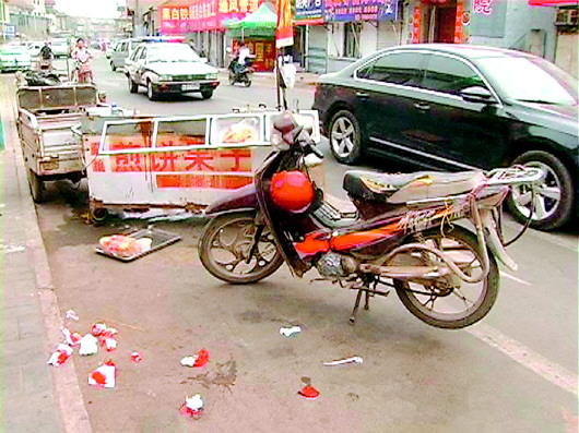 6月1日清晨6点半左右,联四路北头,一辆摩托车启动时突然失控撞向了附近的卖煎饼果子的小摊。一名老人也被撞倒,老人倒地后头部受伤。随后,120救护车赶来将老人送往临近医院救治。