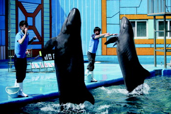 | 小长假期间,青岛海昌极地海洋世界伪虎鲸明星爱福携宝宝督督首次公开亮相。 本报记者 张晓鹏 摄 |