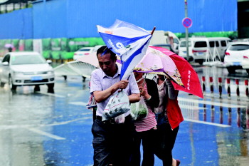 | 1日,在南京路上,一名市民用被风刮坏的伞勉强挡雨。
