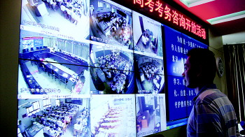 | 指挥中心大屏幕清楚显示各考场内的情况。本报记者 贾凌煜 摄 |
