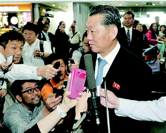 | ◤6月2日晚,结束日朝会谈的朝方代表宋日昊在北京转机时接受采访。 |